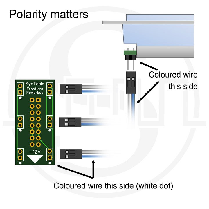 The basic kit offers a mix of 4 colors, red, blue, green, orange, 4 x 50cm (20″) power cables and a eurorack compatible power plug.